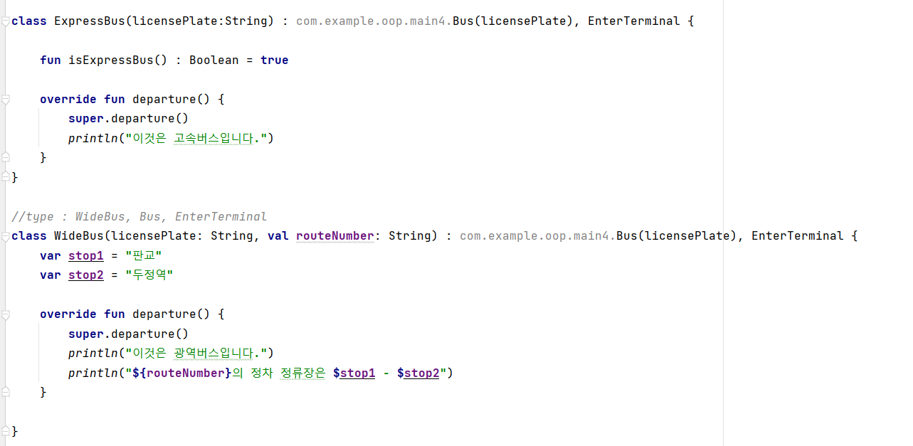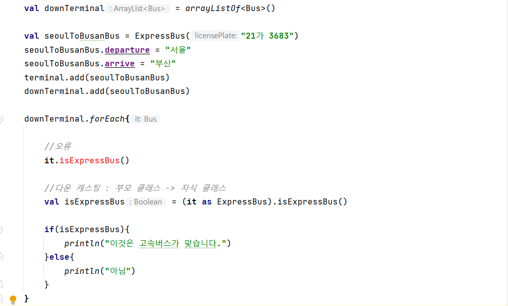 - ExpressBus의 함수로만 선언되어있는 isExpressBus이므로 Bus 타입에서 불러올 시 오류 남