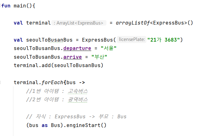 - bus.engineStart() 오류 : Bus 클래스의 함수이므로 ExpressBus 타입으로 함수 불러올 시 오류 남
