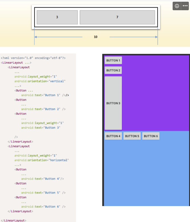 - layoutWeight : 자식들이 배치될 때 전체 영역 대비 비율의 개념으로 가중치 설정