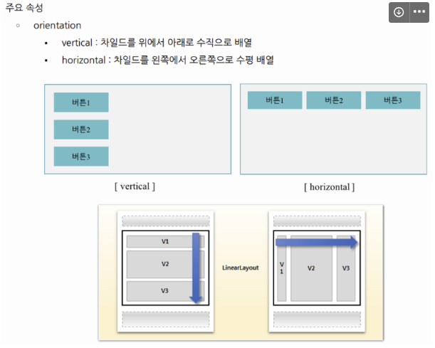 - LinearLayout의 자식으로 배치되는 View 위젯은 오직 한 방향으로만 배치
