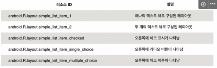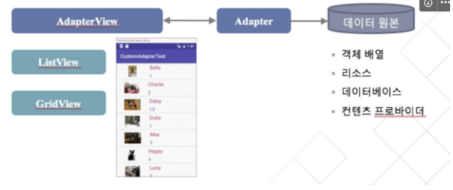 - Adapter : 데이터 테이블을 목록 형태로 보여주기 위해 사용