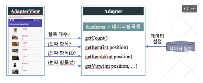 - 표시할 항목 데이터를 직접 관리 X, 어댑터라는 객체로부터 공급 받음
