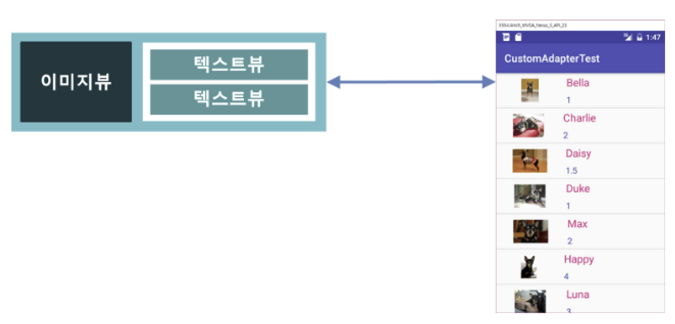 - 앞서 정의한 MyItem 타입의 객체들을 ArrayList로 관리하는 BaseAdapter 사용